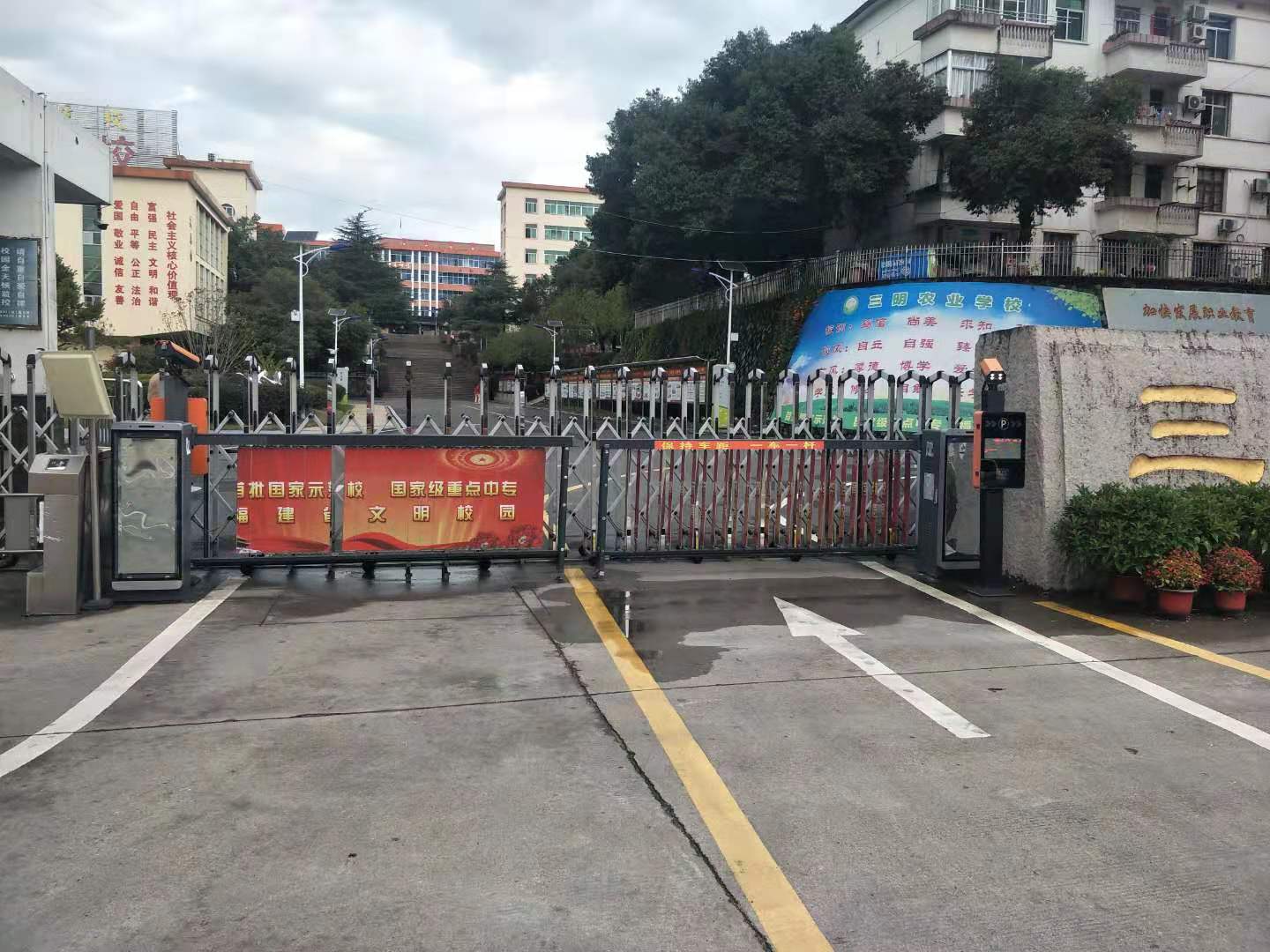 学校及时关闭汽车和摩托车通行车道,关闭伸缩门。所有进出人员一律从行人闸机通行,实行登记手续。从而有效管控外来人员进出,或由本校教职工随车带入人员。