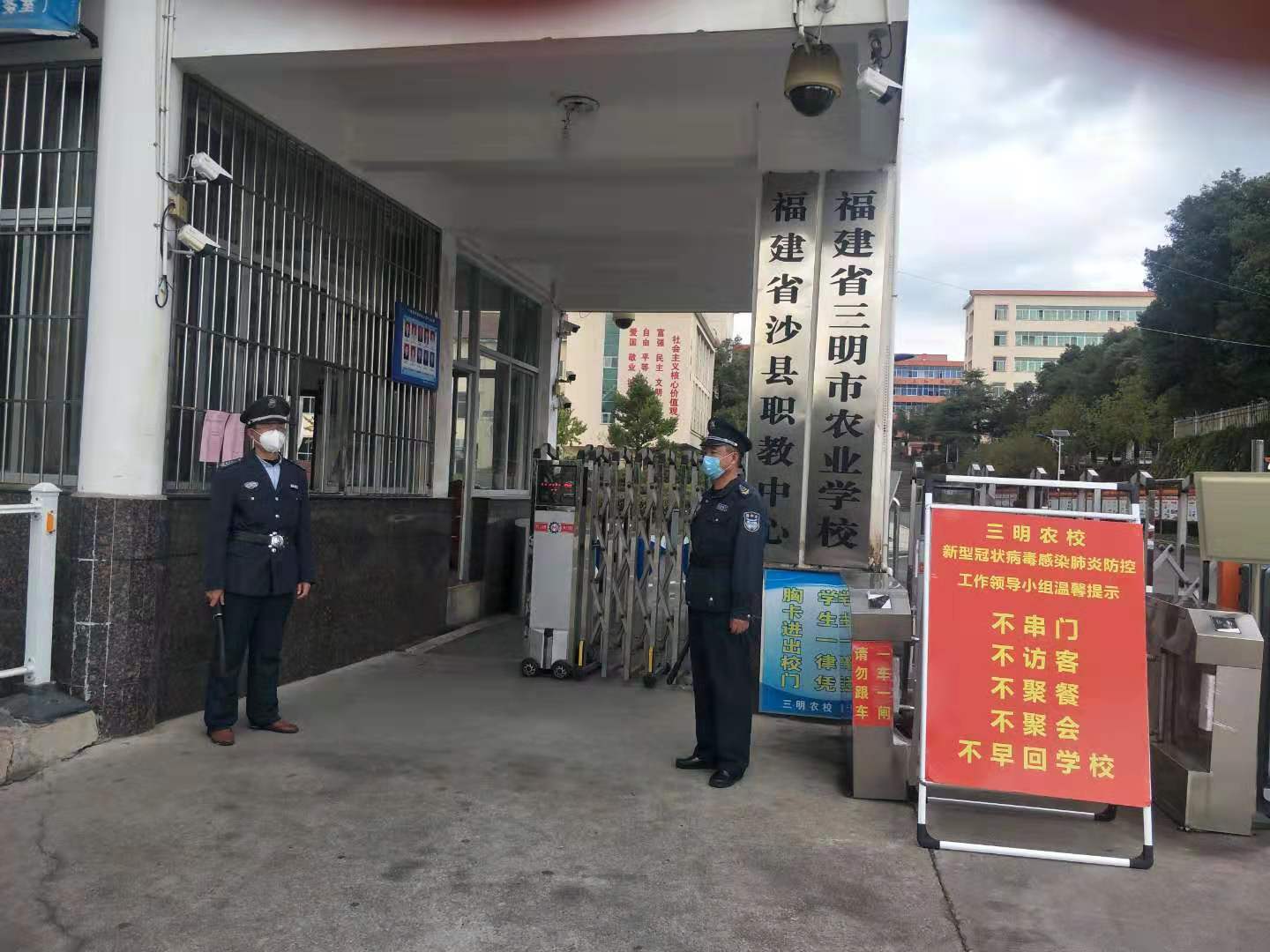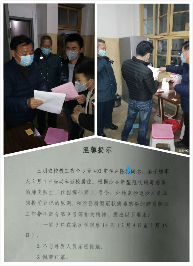 进出人员实行实名登记制度,杜绝一切外来人员进入。落实上级党委、政府和三明市教育、沙县新冠肺炎防控工作指挥部等系列精神,校内教职员工实行一户一天一人外出采购生活必需品 。